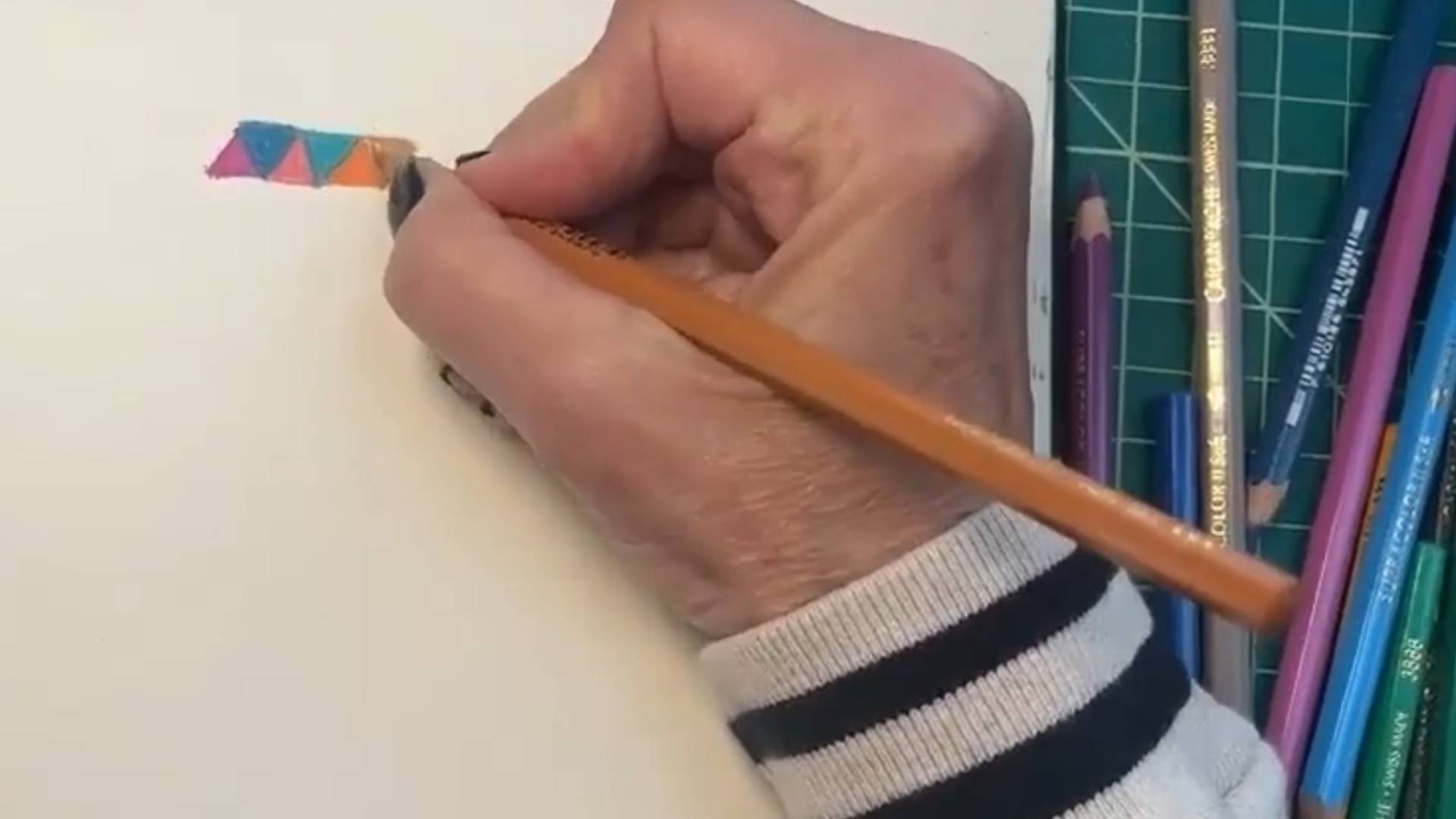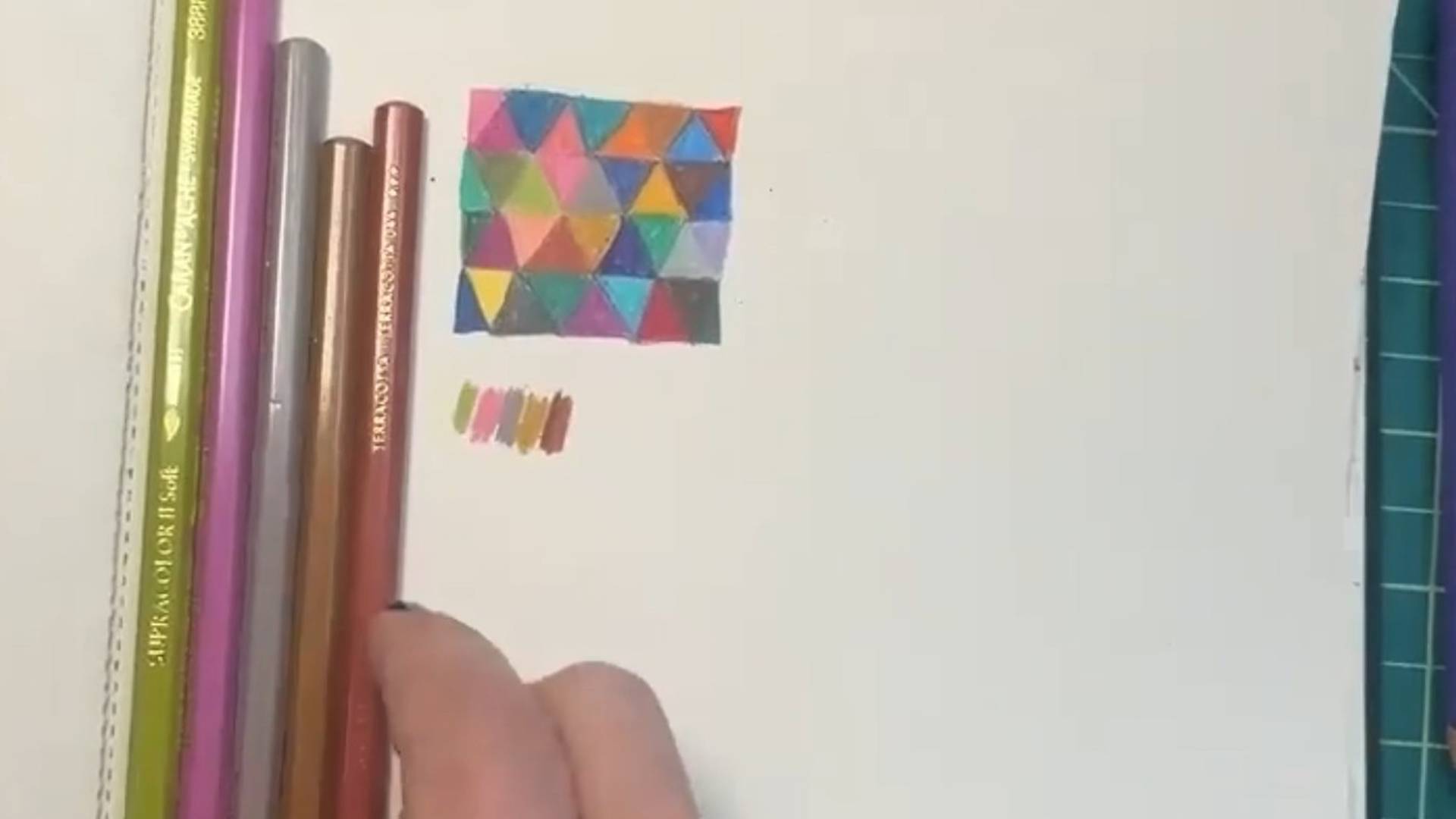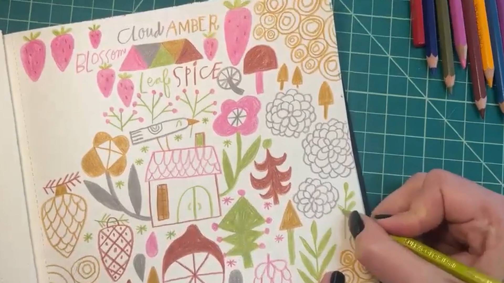 Creating a Colourfully Cohesive Sketchbook by Salli Swindell - Grab some coloured pencils and some paper. Randomly choose a pencil and draw a triangle. Continue randomly choosing pencils and adding triangles to the page. Resist the urge to purposefully pick which colours should go next to each other. (This is harder than it sounds!) Once you've got a few rows done, choose 5 triangles that connect to each other by row or in a hexagon. Think about choosing colours that you don't usually gravitate towards. You now have created a new colour palette! Create 5 larger triangles with those pencils and use your imagination to name each of those colours. Have fun with hand lettering those names next to the corresponding triangle. Now to use that palette! Draw any sort of structure that pops into your head. It can be any style. Now add 'fillers' such as birds, branches, trees, flowers, clouds, patterns. Let your mind go wild.