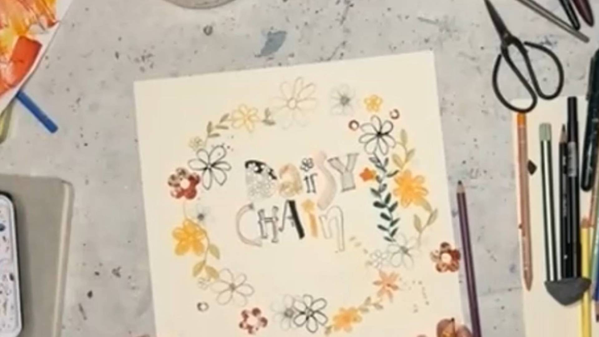 Daisy Chain by Galia Alena - Find a large square of paper and whatever art supplies you have. Use a plate to lightly trace a circle on to your paper as a guide for your daisy chain. Choose a pencil, felt tipped pen or crayon and draw 3 simple daisy forms. Choose another medium and draw 3 more daisies around the circle. Start to connect the daisies together in whatever way you like and then start to decorate the daisies. Think of adding other elements such as leaves, branches or other flowers and embellish with patterns, solid colours, lines, shapes or other details. Think of a saying or some words you'd like to add and write it in the middle of your daisy circle. Use capitals, lower case, decorated letters, simple lines - whatever you'd like. You could even glue on collage pieces. Keep adding to your page until you feel it's finished.